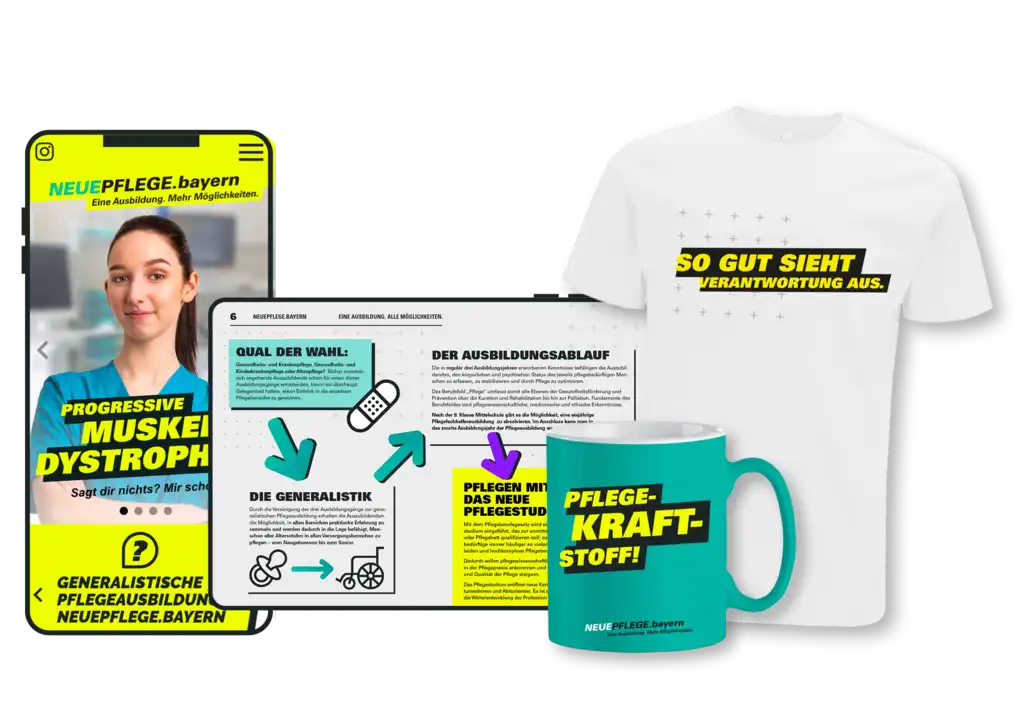 Um Menschen für die generalistische Pflegeausbildung zu gewinnen und mit Vorurteilen aufzuräumen, haben wir im Auftrag des Bayerischen Gesundheits- und Pflegeministeriums eine innovative Ausbildungskampagne entwickelt. Das Motto: „NEUE PFLEGE – Eine Ausbildung. Mehr Möglichkeiten.“ Statt auf Jugendsprache und Promis setzen wir dabei auf Fachlichkeit, echte Azubis und ein starkes Selbstbewusstsein des Berufs.